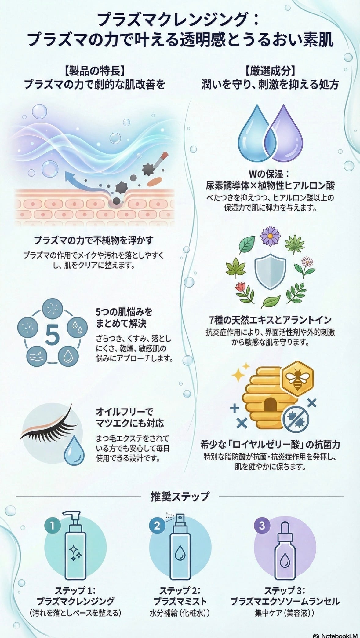 プラズマクレンジングは、肌の状態を劇的に改善する手助けをします。朝晩の最初のケアに取り入れることで、驚くほどのクリア感としっとり感を体感してください。