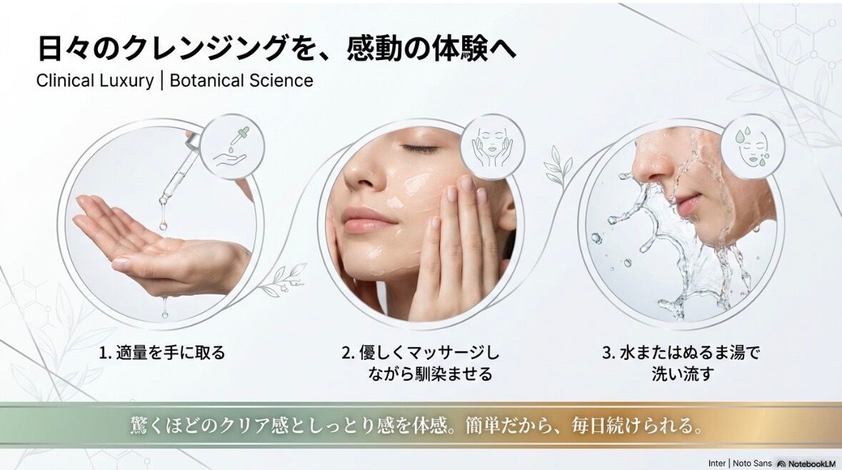 使い方は、適量を手に取り、優しくマッサージしながらお肌全体に馴染ませ、その後水またはぬるま湯で洗い流すだけ。これなら、日々のクレンジングが簡単に続けられますね!