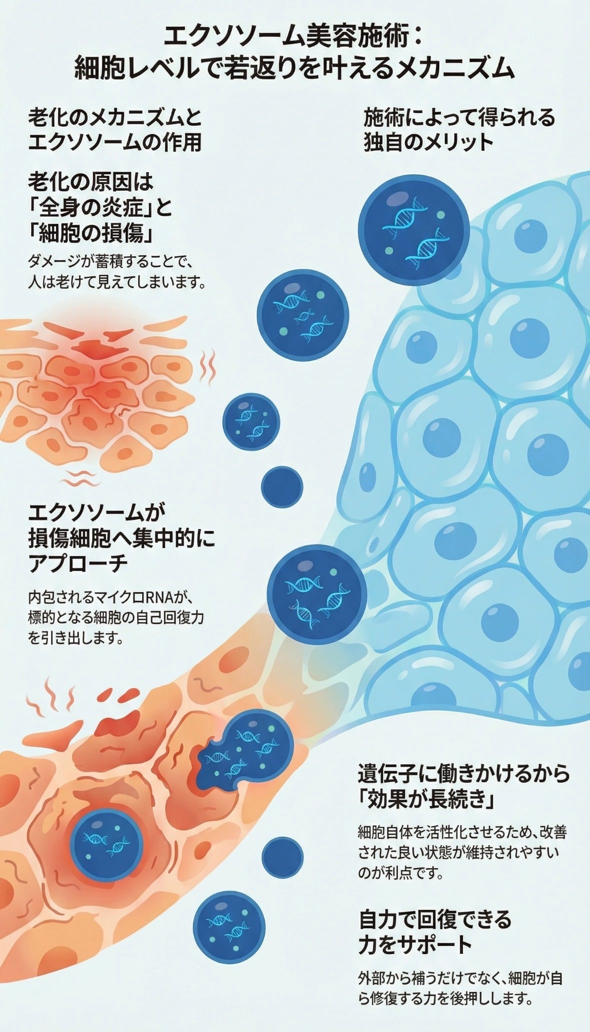 そこで、エクソソームは損傷を受けた細胞に 集まり、エクソソーム内に含まれる マイクロRNAの働きで標的となる細胞が 自力で回復できるよう、働きかけます。