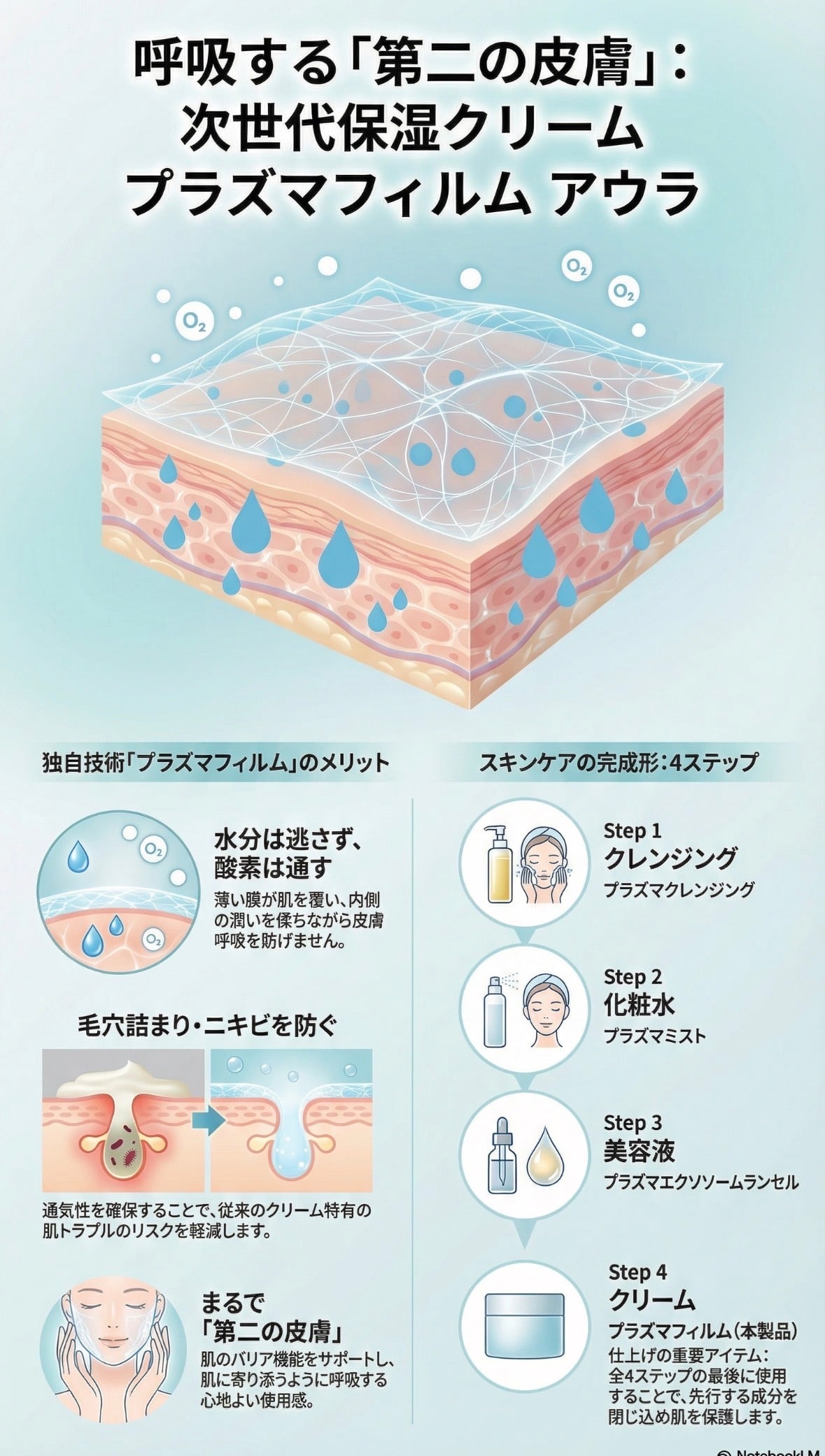 プラズマフィルムクリームは、まるであなたの肌に寄り添うかのように、呼吸をする「第二の皮膚」。肌のバリア機能をサポートし、乾燥からしっかりと肌を守ります。